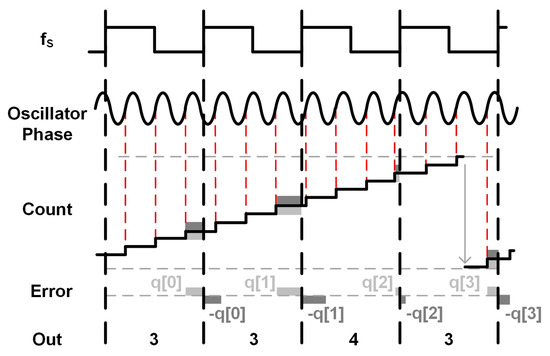 As shown in Figure 10, since the residual phase from the previous sampling period q[n] inherently becomes the initial phase for the next sampling period, when the quantization error of the third sample exceeds one LSB, the output sequence is [3 3 4 3]. At this point, the manifestation of the quantization error is as follows: