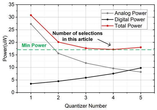 As shown in Figure 11, to balance the reduction in current consumption of the analog VCO and the increased power consumption of multiple phase quantizers, a simulation was conducted to obtain the relationship between the number of phase quantizers and the total power consumption of the chip. From the figure, it is evident that with an increase in the number of phase quantizers, there is a significant reduction in the power consumption of the analog VCO part. The reason for the slow increase in digital power consumption is twofold: on one hand, the digital supply voltage is relatively lower compared to the analog voltage, and on the other hand, the digital part can be optimized through synthesis. When the number of phase quantizers reaches 4, the total power consumption of the entire chip is optimized. Similarly, another reason for selecting 4 phase quantizers is that this count increases the total output bit count by 2 bits. Although using 5 phase quantizers could increase the output bit count by 3 bits, it does not reach saturation, leading to the wastage of chip resources. Therefore, in this design, the number of phase quantizers is set to 4.