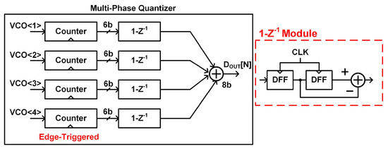 From Equation (8), it can be observed that the quantization error of the VCO quantizer is shaped by first-order noise shaping. Therefore, it is equivalent to a first-order Sigma-Delta modulator.