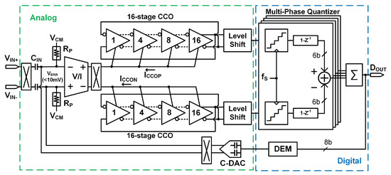 As shown in Figure 3, the VCO-based ADC front end consists of a V/I converter composed of differential pairs M1 and M2 and a set of current-starved voltage-controlled oscillators (CCOs). To enhance the linearity of the differential pairs, a source degeneration structure with a resistor is employed, resulting in the following gain of the V/I converter: