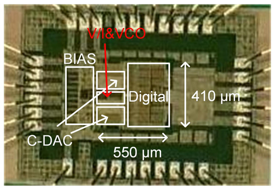 The circuit proposed in this paper is implemented using CMOS 180 nm technology with a core area of 0.225 mm2 (550 m × 410 m). Figure 15 is a microscopic view of the proposed circuit. As shown in Figure 15, the area of the analog part of the V/I and VCO circuit (250 m × 55 m) is only 1/8 that of the digital circuit (280 m × 410 m), indicating that the circuit proposed in this paper is highly digital. The entire chip achieves power consumption of 17.1 W under a power supply voltage of 1.8/1 V. Through simulation verification, if only one quantizer is used to quantize the VCO, the power consumption of the analog section exceeds 20 W. The proposed multi-quantizer structure reduces the analog power consumption to 9.6 W, while the digital circuit consumes 7.5 W. In more advanced processes, the power consumption and area of the digital circuit can be further reduced.