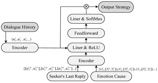 This module used the encoder structure in the transformer network to encode the dialogue history and emotion cause information in the dialogue text and combined it with the initial strategy label to obtain a new strategy label.