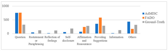 Analyzing the data revealed that FADO tended to classify more labels as “Question” in terms of emotion label prediction, resulting in significantly more labels than the Ground-Truth emotion labels, with only a handful of them correctly classified as “Self-disclosure”. FADO’s prediction results did not correctly classify any related issues in the four labels “Reflection of feelings”, “Restatement or Paraphrasing”, “Information”, and “Others”. In contrast, the label prediction distribution of the AdMISC model was more reasonable, with more labels correctly predicted, highlighting the positive role of the mixed strategy learning module in predicting strategy labels.