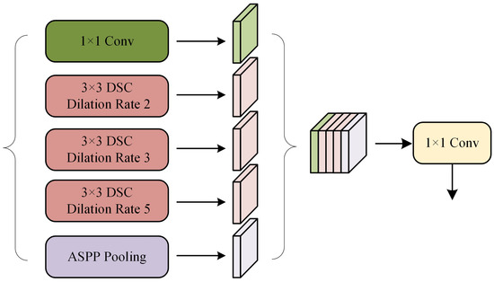 For the purpose of better improving the correlation between local and global information, DeepLabV2 [28] proposes an atrous spatial pyramid pooling (ASPP) structure. The atrous convolution and pooling structure, which together make up ASPP, allow for the extraction of multi-scale features from objects with a larger receptive field while maintaining image resolution, but the module still suffers from the following shortcomings: