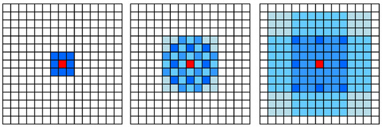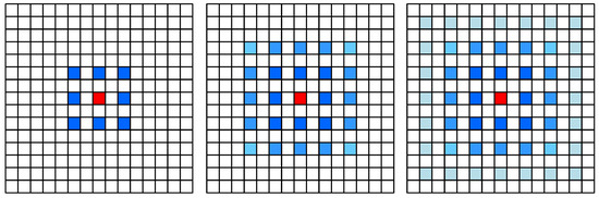 It has been found that the practice of successive atrous convolution at the same dilation rate to obtain the same spatial resolution fills zero between the expanded pixels of the convolution kernel, but the model only samples the locations with non-zero values, thus losing local information and generating the “Gridding” problem, also known as the “Gridding Effect”, as illustrated within Figure 3. The reasonable dilation rate is set as shown in Figure 4. Wang and others [29] proposed the concept of hybrid dilated convolution (HDC), which aims to enable the receptive field’s final size to completely cover a square region with no empty or missing edges after a sequence of convolution processes. Thus, it specifies the standardized construction rule of the atrous convolution: