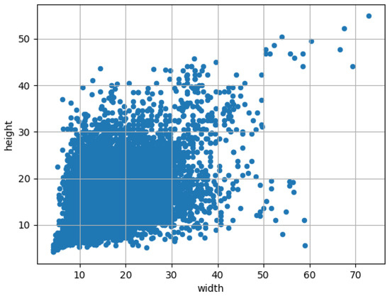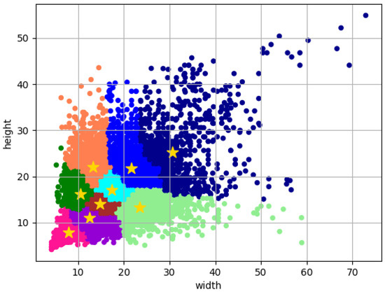 Figure 8 shows the distribution of defective target aspect ratios in the PCB surface defect dataset, and as seen in the figure, the target box dimension’s width and height in the dataset used in this study are mainly concentrated in the intervals of [0∼40, 0∼40]. The resulting intervals also demonstrate that most of the targets in the PCB surface defect dataset are small and that the preset anchor box sizes in the original YOLOv5 are not applicable to the needs of the PCB defect dataset. Figure 9 displays the effects of using the K-means++ clustering method to re-cluster the smaller targets in the PCB surface defects dataset; the clustering center’s number is set to 9. After many iterations of the genetic algorithm, all the data points in the final image are clustered into 9 regions labeled with different colors, where the yellow five-pointed stars represent the clustering centers of the regions, and the various clustering centers indicate that ultimately, we have obtained 9 combinations of different sizes of the anchor box.