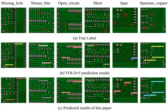 Upon examination of Table 6’s data, it is evident that the results of the comparison experiments show that this paper’s method has a greater advantage in the quantity of parameters compared with the models of Faster-RCNN (VGG16), Faster-RCNN (EfficientNet), Faster-RCNN (MobileNetV2), and YOLOv3; the mean average precision improved by 5.15%, 7.58%, 7.14%, and 3.4%, respectively; and the speed of detecting images per second improved by 85.18 frames, 72.86 frames, 76.71 frames, and 71.13 frames, respectively. The comprehensive performance of this paper’s model clearly has a significant advantage; not only has the mean average precision been improved to varying degrees, but the inference is also faster. In contrast to the CSPNet-based original YOLOv5 model, the improved model in this paper improved the mean average precision by 2.71%. However, due to an increase in model complexity, the quantity of parameters in the model increased by 28.3%, and the detection speed decreased by 10.84 frames. Despite the fact that the detection speed has somewhat decreased, the model designed in this paper can achieve better detection results under the premise of close to 100 frames per second, to satisfy the needs of industrial PCB defect detection, and the focus is to improve the defect detection precision, which is more crucial for the high-quality production of PCB, demonstrating the effectiveness of this paper’s method for the application of PCB surface defect detection.