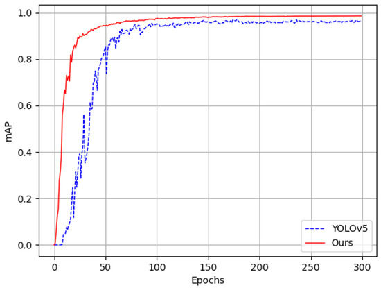 As seen in Figure 11, the mean average precision curves trained by this paper’s model and the unimproved YOLOv5 model are plotted as a comparison image by visualizing the data of the training process. The comparison shows that the mean average precision of this paper’s model has better performance and is basically in the convergence state after 50 epochs of training. The fluctuation of the curve at the late stage of training is better than that of the unimproved YOLOv5 model, which proves the strong stability of the method used in this study.