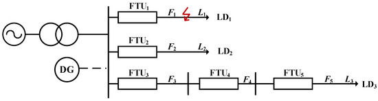 When the DG is connected, as illustrated in Figure 4, it will have an impact on the traditional relay protection device, making the distribution network structure more complex. The power direction will appear to be a bidirectional flow, the location of the DG access will have an impact on the size of the fault current as well as the phase, and the fault information uploaded by some of the FTUs (Feeder Terminal Units) will be incomplete, which leads to the inaccuracy of the traditional fault location method [32].