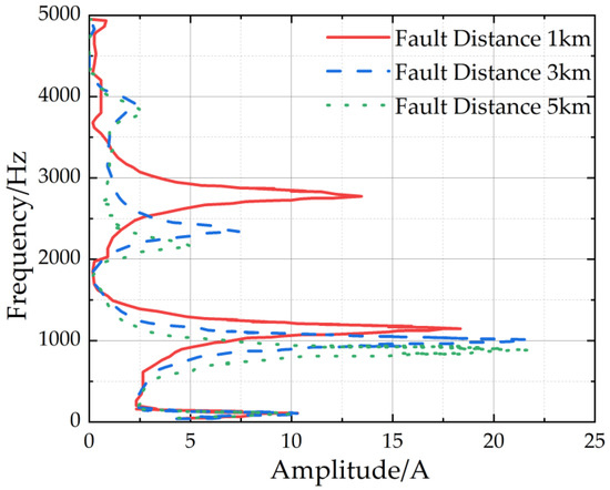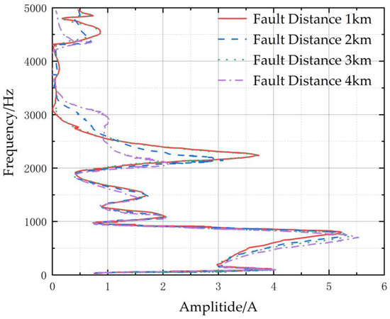 We constructed the model containing three cable lines in Simulink, each of which was 6 km long. The parameters were set as follows. The grounding inductance was set to 0.5463 H, and the grounding resistance is set to 5.149 Ω. The line unit length resistance, inductance, and capacitance were 0.102 Ω/km, 0.892 × 10−3 H/km, and 0.212 × 10−6 F/km, respectively. The closing angle was set to 90°, while the transition resistance was set to 1 Ω. The transient zero-sequence current spectrum at the end of line 3, for various fault distances, is depicted in Figure 6. It is evident that, with an increasing fault distance, the current spectrum progressively shifts to the left, resulting in a decrease in the frequency of each resonance peak.