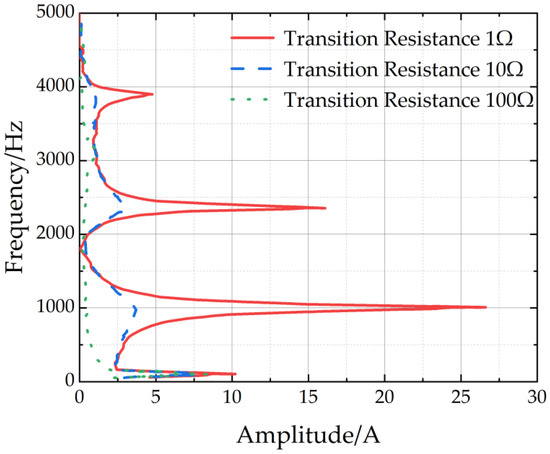 Here, we will investigate the impact of transition resistance on the zero-sequence current spectrum. The fault distance was kept to 3 km, with a closing angle of 90°. The transition resistance ranged from 1 Ω to 100 Ω. The zero-sequence current spectrum is shown in Figure 7. The larger the transition resistance, the more obvious the attenuation of each frequency component of the current spectrum. The degree of attenuation of the high-frequency component was greater than that of the industrial frequency and its nearby low-frequency components. As the transition resistance increased, the resonance peak of the current spectrum became less and less pronounced.