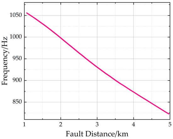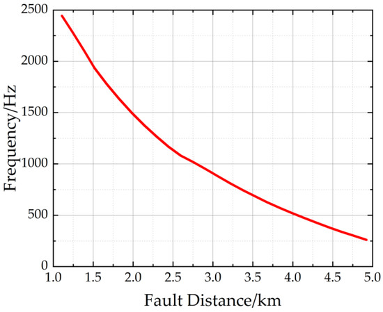 The relationship between the centroid frequency and fault distance is illustrated in Figure 10. The graph clearly demonstrates that the increase in the fault distance led to a decrease in the centroid frequency of the zero-sequence transient fault current spectrum. Furthermore, the longer fault distances caused a leftward shift in the current spectrum.