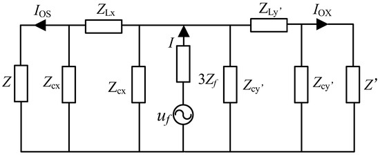 The centroid frequency can remain constant when different fault conditions happen. But one centroid frequency may correspond to different fault distances. Consequently, auxiliary criteria are essential for a more precise determination of the fault distance. The zero-sequence π-equivalent circuit for fault distance measurement is illustrated in Figure 11 [41].