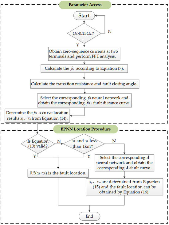The BPNN is capable of acquiring the curve of any closing angle and transition resistance [38]. In the event of an asymmetrical fault, the fault line is initially determined by the line selection algorithm, while the closing angle can be obtained from the oscilloscope. The transition resistance is calculated using the appropriate method, as in Reference [39]. Subsequently, the BPNN is employed to simulate the curve under the fault condition. By analyzing the transient current samples within the corresponding frequency band, the spectral centroid frequency can be determined, enabling the calculation of the fault distance.