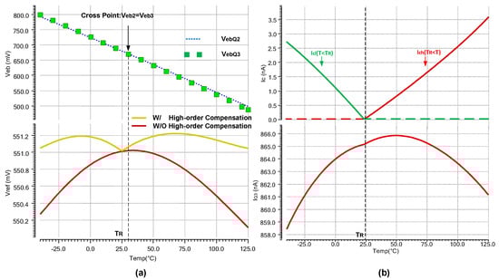 Combining Equations (9) and (10), the intersection of VebQ3 and VebQ2 is obviously at TR. Curvature compensation is implemented, making the cross point of VebQ3 and VebQ2 located in the stationary point of the curve of Vref_1st, with the varying temperatures in Figure 3a.