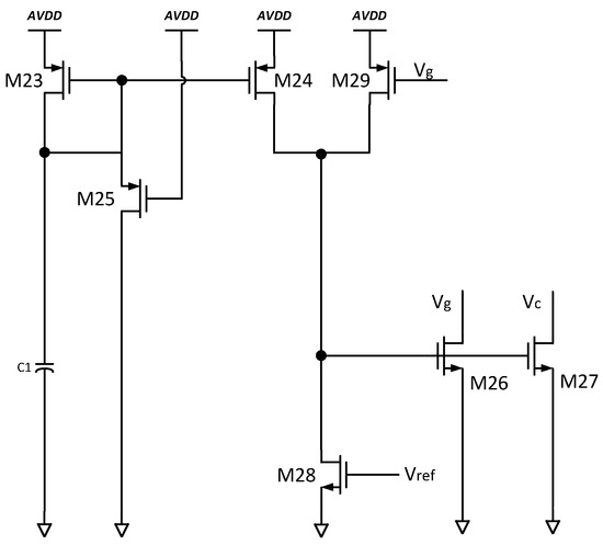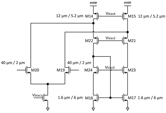It is evident that the input common-mode voltage of the OPA is Veb, which is between 800 mV and 500 mV from −40 °C to 125 °C. If PMOS differential input stages are used, the minimum supply voltage must meet the following formula: AVDDmin > |Vthp | + VDSp + Vebmax. As the supply voltage is approximately 1 V, the NMOS differential input stage is chosen instead of the PMOS differential input stage, and the minimum supply voltage is AVDDmin = 2VDSp + Vebmax ≈ 950 mV < 1 V, which is suitable for our design. 2VDSp, which is approximately 150 mV, represents the sum of the VDS of M2 and the VDS of M5 in Figure 2. In our process, the threshold voltage of the NMOS varies from 258 mV to 415 mV when W/L = 10 μm/10 μm and from 366 mV to 514 mV when W/L = 10 μm/0.18 μm, which satisfies the design requirements. The implementation of the OPA is illustrated in Figure 4.