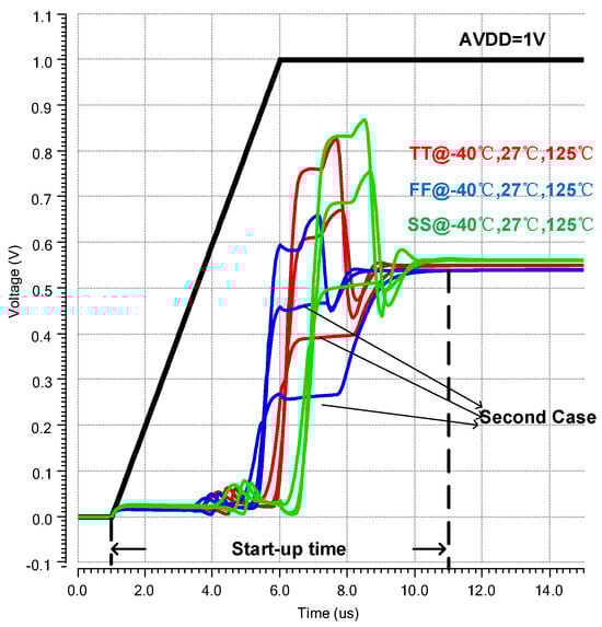 Upon powering on, the BGR core circuit initially enters the first state. Vref is zero, and transistor M28 is turned off. At this stage, transistor M23 begins to charge C1; meanwhile, transistor M24 charges the gate of transistors M26 and M27. Consequently, M26 and M27 turn on, resulting in Vg and Vc being pulled down. Currents begin to flow in the two arms of the BGR core circuit. Subsequently, the BGR core circuit may transition to the second state, where Vref is between the desired value and zero. Additionally, M28 turns on. To ensure the BGR core circuit exits the second state and reaches the expected stable state, M26 and M27 cannot be turned off. Therefore, it becomes necessary to introduce transistor M29 to continue charging the gates of M26 and M27. Once the circuit is functioning properly, Vref becomes sufficiently large to drive M28 into the linear region. Finally, M26 and M27 remain off. During power-off, transistor M25 is utilized to discharge the charge stored in C1. Figure 6 illustrates the simulated start-up waveforms of the proposed BGR.