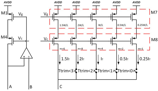 For high-order temperature trimming, the coefficients k4 and k5 are adjusted, as determined by Formulas (12) and (13). Similar to (W/L)M7, (W/L)M9–12 is used to adjust k4 and k5. In this work, K4trim<4:0> and K5trim<4:0> are utilized to adjust k4 and k5, respectively.