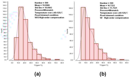 To assess the impact of process variation and device mismatch on the reference output Vref and TC, Monte Carlo simulations were completed using foundry-supplied statistical device models with activated mismatch and process variations. In order to observe the worst-case results, no specific correlation coefficients were defined for the matched devices. Figure 9a displays the estimated TC results without high-order compensation from 500 Monte Carlo runs under 1 V power supply voltage. Figure 9b shows the estimated TC results with high-order compensation from 500 Monte Carlo runs under 1 V power supply voltage. Comparing Figure 9a and Figure 9b, it is clear the normal distributions of TC are similar under fixed trimmed conditions. This is because high-order compensation is dependent on the outcome of first-order compensation. In certain process and mismatch conditions, the Vref will deviate significantly from the expected result. Therefore, trimming is necessary to ensure better measurement results.