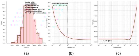 Figure 10a displays the results of the estimated reference voltage Vref from 500 Monte Carlo runs under 1 V power supply voltage, indicating its stability. Figure 10b shows the noise spectrum of the simulated bandgap output under 1 V power supply voltage. The integrated output noise from 0.1 Hz to 10 Hz is 81.12 μV. The simulated PSRR of the BGR circuit under 1 V power supply voltage is shown in Figure 10c, where the PSRR at a low frequency is −67.5 dB at 27 °C.