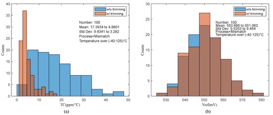 In order to verify the effect of the trimming circuit, the results w/trimming and w/o trimming are shown in Figure 11a and used for a comparison. The estimated TC results w/trimming and TC results w/o trimming from 100 Monte Carlo runs under 1 V power supply voltage are presented in Figure 11a. The estimated TC results w/o trimming are in the range of 2 ppm/°C to 50 ppm/°C. The estimated TC results w/trimming are from 1.2 ppm/°C to 17 ppm/°C. The variance and mean of TC results w/trimming were improved to a great extent. This verifies the effectiveness of the trimming circuit. The Vref is mainly affected by the input-referred offset voltage within OPA in Figure 1. The temperature dependence of the input-referred offset is not modeled in this analysis, which assumes that the variation in temperature is small. Hence, the impacts on Vref can be captured with the following equations: