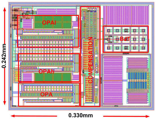 The σ of VOS are 1.5 mV, which is assessed based on the Monte Carlo simulations from 500 runs. Figure 11b displays the estimated Vref results w/trimming and Vref results w/o trimming. According to Equation (16), the σ of Vref affected by VOS is 6.18 mV. The estimated Vref results w/trimming and Vref results w/o trimming under 1 V power supply voltage presented in Figure 11b are essentially consistent. The variance and mean of Vref results are essentially the same. The σ of Vref is 9.5 mV, which is primarily affected by the VOS of OPA. This is generally consistent with the analysis. To reduce the systematic offset, a folded cascode amplifier with a gain greater than 60 dB is employed. To reduce the random offset, the sizes of transistors M14–M17 (the current mirrors in the OPA) and M19–M20 (the input pairs of the OPA) are enlarged. The extra methods, such as auto-zeroing and chopping techniques, are applied in the existing literature. These techniques are not used in this article because it is not the key point of this paper. Figure 12 shows the layout of the proposed BGR circuit implemented using a 0.18 μm Bipolar-CMOS-DMOS process. The performance summary and comparison of the proposed bandgap circuit is given in Table 2.