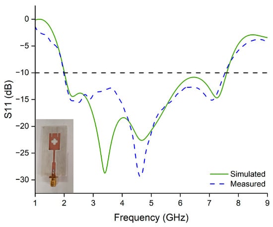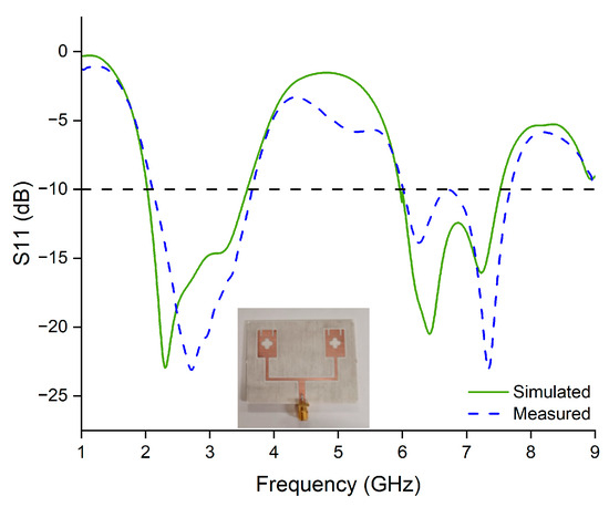 The radiating element consists of a rectangular patch with five circular slots (radius = 1.5 mm) forming a rose-shaped slot at the center, along with two thin slots (1 × 4 mm2) at the top of the patch. A 50 Ω microstrip feedline with a width of 3.5 mm was used to feed the antenna. Impedance matching between the transmission line and the rectangular patch was accomplished by using a quarter-wavelength transformer with a characteristic impedance of 75 ohm. As displayed in Figure 1, the portion of Lf1 = 12 mm that extends 8.5 mm above the ground plane forms the microstrip transmission line. The proposed single-element antenna has a wideband behavior spanning from 2 to 7.62 GHz, which covers most of the frequency bands allocated for WiMAX, sub-6 GHz, and sub-7 GHz applications, as shown in Figure 2.