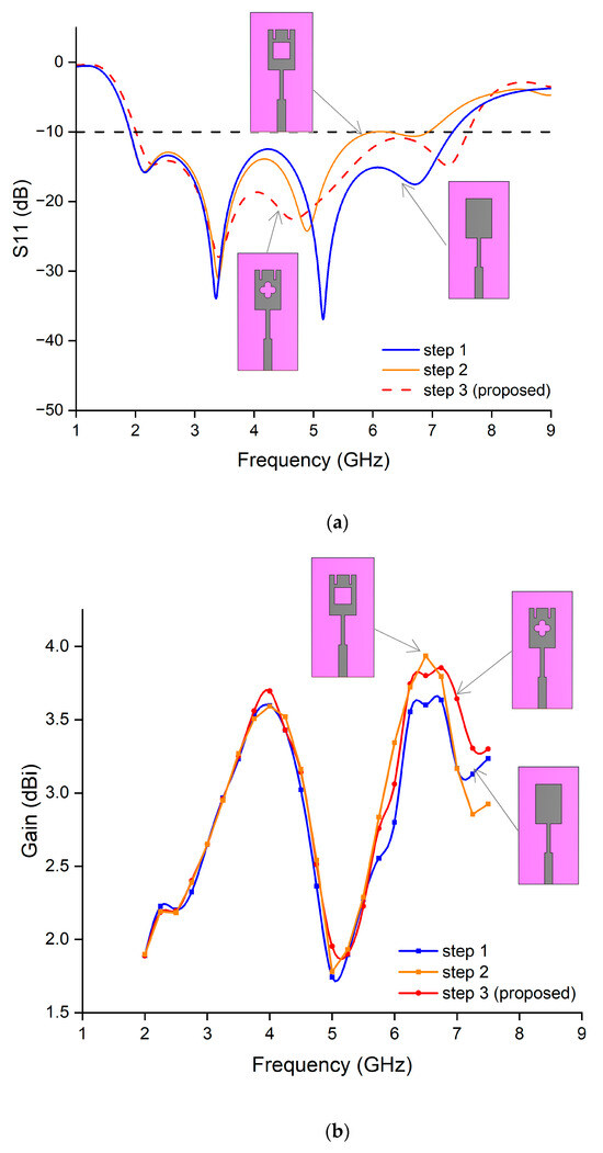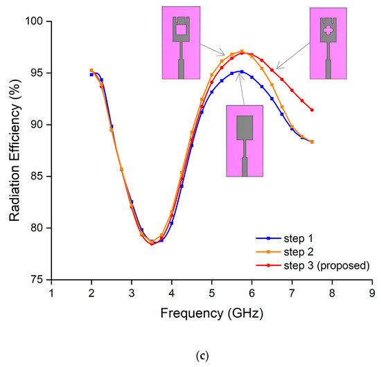 The design procedure of the antenna can be understood from Figure 3. Different configurations were designed from step 1 to step 3 to improve the antenna’s bandwidth, gain, and efficiency. As seen in Figure 3, the rose-shaped slot, along with two thin slots at the top of the monopole patch (step 3), was ultimately chosen as the most effective design for improving antenna performance. The inclusion of these slots led to increased bandwidth and gain in the higher-frequency region, as seen in Figure 3a,b, compared to the other antenna configurations (steps 1 and 2). It is also noted that the addition of these slots effectively contributed to the increase in radiation efficiency in the higher-frequency region, which is attributed to the higher gain achieved in that region, as illustrated in Figure 3c. These improvements show that these slots effectively modify the radiation characteristics of the antenna, leading to enhanced directivity and radiation efficiency at higher frequencies. It is important to highlight that the thin slots, along with the rose-shaped slot, contributed together to enhancing the antenna’s performance. Utilizing only the thin slots did not lead to any performance improvement, whereas employing only the rose-shaped slot resulted in the degradation of antenna performance. However, when both types of slots were used together, they notably enhanced the antenna performance. This improvement was due to the modified surface current distribution induced by the combined effect of the slots. Therefore, only the results for both types of slots used together in the same design were considered and are presented in Figure 3.