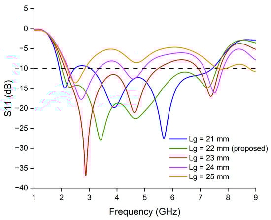 A crucial parameter that greatly influences the antenna’s performance regarding return loss is the length of the ground plane (Lg). For the ground plane to fully cover both the 50 ohm and 75 ohm transmission lines and form a quarter-wave transformer, the maximum value of Lg should be Lf + Lf1 = 25.5 mm. If it exceeds this value, the structure will start to resemble a microstrip patch rather than a printed monopole. Therefore, a maximum of 25 mm was selected for Lg analysis. On the other hand, considering the frequency range of 2–7.62 GHz, the center frequency is approximately 4.8 GHz. For a 75 ohm transmission line at 4.8 GHz, the quarter wavelength is about 9.5 mm. When Lf = 13.5 mm is added to this, theoretically, Lg = 9.5 + 13.5 = 23 mm can be selected. By performing a parametric sweep around the theoretical value of 23 mm (±2 mm), the most optimal value of Lg was found to be 22 mm, as shown in Figure 4. This value closely aligns with the theoretical expectation. At Lg = 22 mm (proposed), the antenna demonstrates a wideband response spanning from 2 to 7.62 GHz. The adjustment in Lg improves impedance matching. This impedance matching is crucial for maximizing power transfer and, consequently, enhancing radiation efficiency and bandwidth. The design parameters of the single-monopole antenna are provided in Table 1.