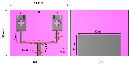 Antenna arrays typically provide increased gain compared to a single element, making them suitable for meeting the requirements of 5G technology [16]. A monopole antenna array is a configuration of multiple monopole antennas arranged next to each other. When signals from multiple antennas are combined, they experience constructive or destructive interference depending on their relative phases. The constructive interference results in an increase in signal strength, effectively enhancing the gain of the array in the desired direction, while destructive interference is used to suppress energy from undesired directions [17]. Thus, to increase the antenna gain, the single element was converted into a linear array consisting of two elements as depicted in Figure 5. The feeding network was designed and optimized to achieve the desired performance. Initially, the monopole antennas were matched to 75 ohm transmission lines. Afterwards, the feed networks of the 2 × 1 antenna array were combined using a T-junction, enabling the entire array to be matched to a 50 ohm transmission line.