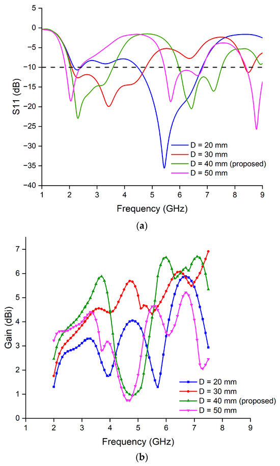 The spacing between patches in an antenna array plays a pivotal role in influencing its dual-band behavior, as demonstrated in the analysis depicted in Figure 7. Systematic variation in the spacing (D) from 20 mm to 50 mm was conducted to optimize the antenna performance across the WiMAX band (2.5 GHz), 5G sub-6 GHz band (n78), and 5G sub-7 GHz band (n96).