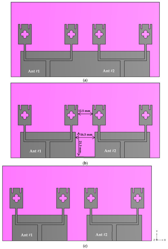 Two-element MIMO antenna design: (a) partial common ground plane; (b) partial slotted common ground plane (proposed); (c) partial separated ground plane.
