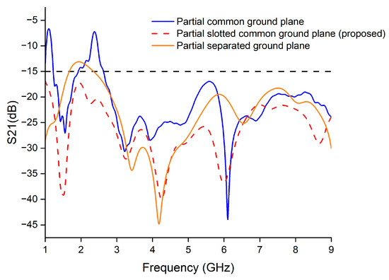 MIMO technology has the capacity to improve communication systems by enhancing link quality, minimizing the impacts of multipath fading, and increasing spectral efficiency [19]. In this section, we extend the 2 × 1 antenna array to a two-port MIMO antenna with a size of 126 × 63 mm2. Initially, the two antennas were designed in series with a common partial ground plane (109 × 27 mm2), as illustrated in Figure 8a. As depicted in Figure 9, the isolation between ports reached 7 dB within the desired bands, which falls far below the acceptable value of 15 dB required for optimal MIMO antenna performance. To enhance the isolation, a rectangular slot was introduced in the middle part of the ground plane, as shown in Figure 8b. By adding this slot, the isolation improved significantly from 7 dB to 20 dB, as demonstrated in Figure 9. The presence of the slot changed the distribution of the electromagnetic fields and disrupted the electromagnetic coupling between antenna elements by modifying the current paths on the ground plane [20]. This modification led to reduced mutual coupling and interference, thus enhancing isolation. For additional insight, a completely separated ground plane structure was employed to examine its impact on isolation, as depicted in Figure 8c. In Figure 9, it is evident that the separated ground planes resulted in decreased isolation in both the lower and upper frequency bands compared to the partial slotted common ground plane. Thus, for better isolation a 16.5 × 21.3 mm2 rectangular slot was etched on the ground plane. The width and length of this rectangular slot were carefully optimized to enhance isolation while maintaining dual-band behavior. Since there should be a ground plane under the 75 ohm transmission lines feeding the antennas, the width of the ground plane was ensured to be twice the width of these lines on the sides, and the remaining parts in between were emptied. As the common ground plane contributed to lowering the isolation compared to the separated one, the depth of the slot (21.3 mm) was made as deep as possible without compromising the electrical common ground plane.