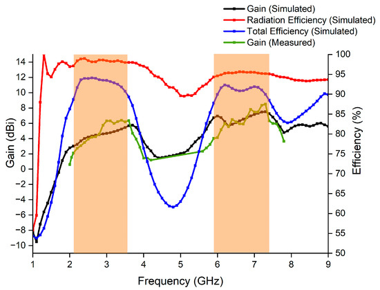 The S-parameters of the MIMO antenna, both simulated and measured, are plotted in Figure 11. The proposed MIMO antenna covers dual bands, ranging from 2.1 to 3.6 GHz and 5.9 to 7.4 GHz and encompassing three bands: 2.5 GHz (2.3–2.7 GHz), n78 (3.3–3.6 GHz), and n96 (5.925–7.1 GHz). It was designed for WiMAX, sub-6 GHz, and sub-7 GHz applications. The proposed antenna provides improved isolation exceeding 20 dB between its ports across the operational frequency bands. The simulation and measurement results exhibit good agreement.