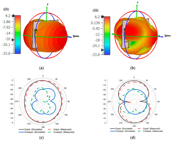 Figure 12 shows the realized gain and radiation efficiency over the frequency of the proposed MIMO antenna. The MIMO antenna exhibits a peak gain of 7.5 dBi, along with a maximum radiation and total efficiency of 99% and 96%, respectively. The gain measurements of the antenna were obtained using a comparison method, where the gain of the antenna was compared to that of a reference antenna with a known gain. An Aaronia Hyperlog 60180 wideband log-periodic antenna (Aaronia, Strickscheid, Germany), which has a gain close to the designed antenna (approximately 5–6 dBi in the relevant frequency range) was selected as the reference antenna. During the measurements, the position of the Aaronia Powerlog 70180 wideband horn antenna, which has a gain of 10–13 dBi within the relevant frequency range, was kept fixed. Each of the MIMO antennas as well as the reference antenna were placed one by one along the broadside direction of the horn antenna, and the gain values of the proposed antenna were determined from the difference in S21(dB) readings on the VNA. The MIMO antenna’s two-dimensional (2D) and three-dimensional (3D) radiation patterns at 2.5 GHz and 6.2 GHz are shown in Figure 13. It is noted that the radiation patterns show more directed features at 6.2 GHz compared to the omnidirectional characteristics at 2.5 GHz. This difference can be explained by the upper frequency band’s greater gain over the lower frequency band. The simulation results are consistent with the measurements findings.