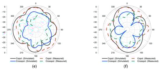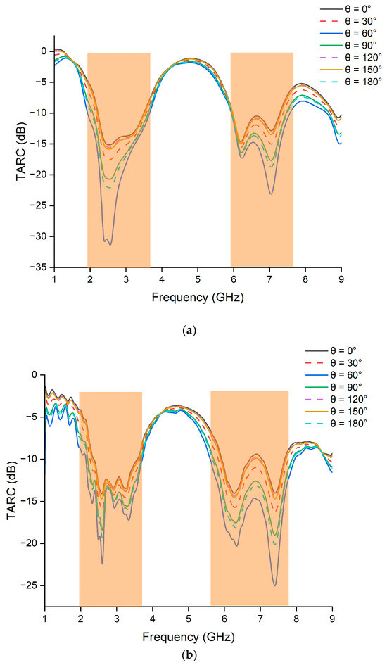 TARCs were obtained for different excitation phases (θ) which vary from 0° to 180° in steps of 30°. Both measured and simulated TARCs for the desired bands are depicted as being less than −10 dB in Figure 17.