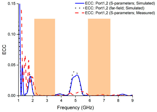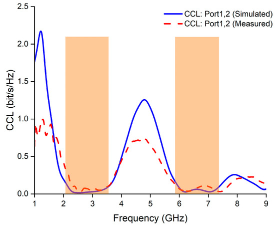 Figure 16 shows that in the desired bands, the simulated and measured values of CCL are less than 0.1 bps/Hz, which is below the acceptable limit of 0.5 bps/Hz [27].