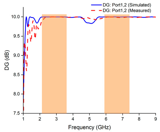 The diversity gain (DG) parameter measures how effectively the introduction of additional antennas (MIMO antennas) reduces the transmission loss or degradation that can occur in wireless communication due to factors like fading, interference, and attenuation [24,25]. The DG can be calculated by using Equation (5):