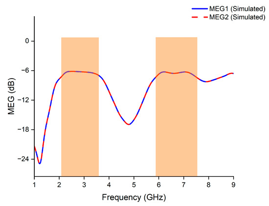 According to Figure 18, the simulated MEG values change between −6.2 dB and −7 dB in the desired bands, which falls within the acceptable range mentioned above.