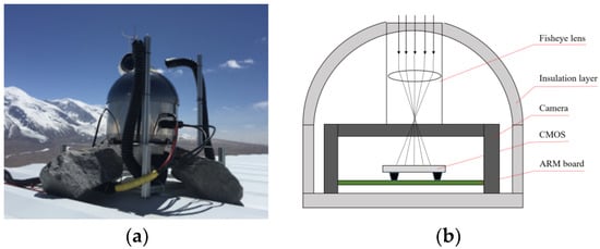 We use the nighttime cloud images collected from KLCAM (Kunlun Cloud and Aurora Monitor). The KLCAM was built by the National Astronomical Observatories (NAO) and installed at the Muztagh Observatory (74°53′48″ E, 38°19′47″ N) in April 2017. It operated until August 2019 and 48,870 images were obtained, with an exposure time of 30 s. The KLCAM (see Figure 1a) has a 3456 × 5184 Canon EOS 100D camera (Beijing, China) and a Sigma 5 mm f/2.8 fisheye lens. KLCAM generated one image every 30 min. Figure 1b shows the structural schematic of KLCAM. A customized ARM-based computer controls the image acquisition and storage []. The format of raw images is RGGB. We used the two green channels as samples and merged the pixel values of the two green channels into a single channel.