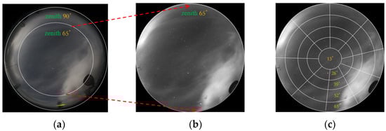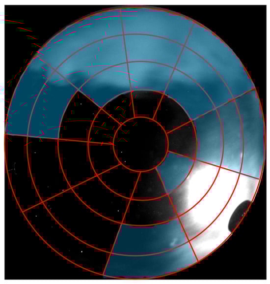 (2) Subregion division: We adopted a similar method to that used for TMT site testing [], which is widely used to classify clouds in astronomy. The TMT method divides each image into two rings centered on the local zenith. The outer ring is the area between the zenith angles of 44.7° and 65°. The inner ring is the area within the zenith angle of 44.7°. The advantage of this division is that the outer ring has the same area as the inner ring. The area outside the outer ring is ignored because of the observing limit of TMT. Our method divides each image into many subregions to get detailed spatial information. The borders of these subregions are defined in terms of zenith and azimuth. First, we divide each image into five rings centered at the local zenith, and each ring occupies the zenith angle of 13°. Then, we divide each image into 37 subregions, and the azimuth angle range of each subregion was 40°. This subregion division has the advantage that segments on the same circle have the same elevation and air mass. The labeled subregions are shown in Figure 4c.