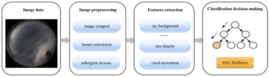 We adopt a PSO+XGBoost model to classify nighttime cloud images automatically. The workflow of our framework is illustrated in Figure 6. Our framework comprises three components: image preprocessing, feature extraction, and classification decision-making. More specifically, image preprocessing is the premise of cloud identification. We apply feature extraction to each subregion to generate new features. These new features are inputted into the PSO+XGBoost model for cloud identification. The image preprocessing is explained in the previous section. The details of the following two components are presented in the subsequent parts of this section.