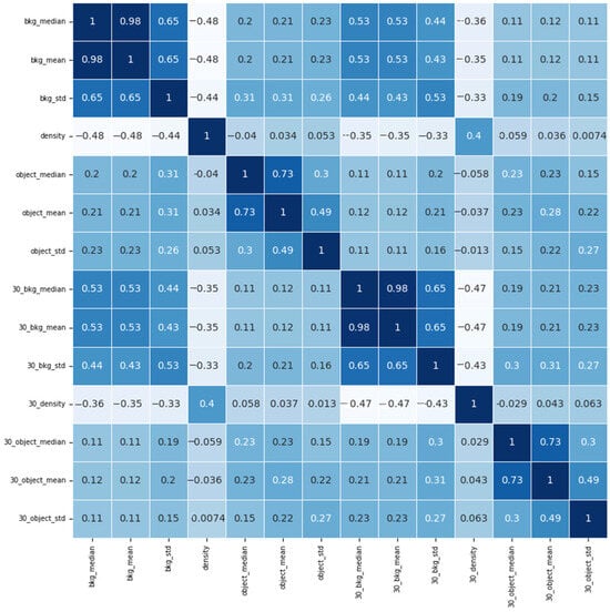 The correlation matrix between features is shown in Figure 7; the color intensity in the figure indicates the strength of the correlation among features. Cells with more blue indicate stronger positive correlations between two features and vice versa. It can be seen that the maximum correlation coefficient between the seven features in the current images and those from 30 min ago is 0.53, which is a moderate correlation. The rest of the correlation coefficients are lower than 0.39. Hence, it can be concluded that the movement of clouds will not introduce a high correlation in features.