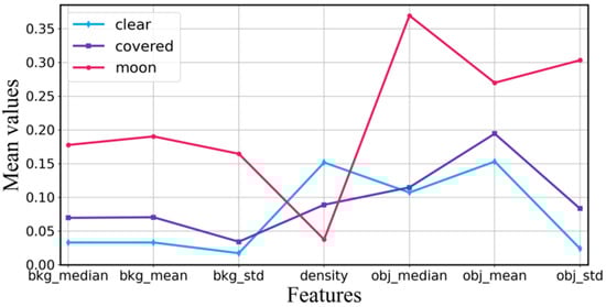 where X represents the original feature values, is the data matrix after normalization, and Xmin and Xmax represent the maximum and minimum values for each feature across all samples, respectively. And their mean values are plotted in Figure 8. It can be seen from Figure 8 that the distances for different cloud categories are significantly distinct. This means that there is a high correlation between the features and the categories of clouds. All feature values are at their highest position when the moon exists in a subregion, except for the star density. The “covered” feature curve is located between the “clear” and “moon” feature curves. When the sky is clear, the value of star density is at its highest position, while all other features show the lowest values.