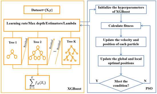 The XGBoost model includes essential hyperparameters such as the learning rate, maximum number of iterations, maximum depth, and L2 regularization term. The model’s performance profoundly depends on the expert’s experience, and the model is prone to local optimization due to the vast number of hyperparameters. To address the issue, various stochastic techniques, such as simulated annealing [], genetic algorithm [], and PSO [], are employed. The PSO method possesses several benefits over other algorithms, including robust global search capability, parallel search capability, and straightforward programming implementation. Therefore, the PSO is selected to optimize the hyperparameters of XGBoost. The PSO algorithm is a heuristic methodology that draws inspiration from the collective foraging activities observed in birds. It continuously alters the movement of the whole group through sharing knowledge among group members. The target of the PSO algorithm is to ultimately realize the global optimal solution to the problem. The flowchart of PSO+XGBoost is shown in Figure 9.