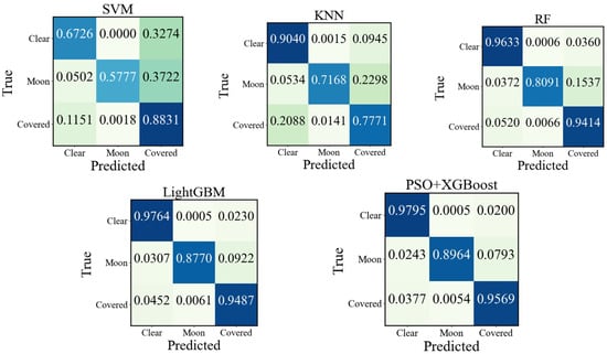To evaluate the classification results more intuitively, a confusion matrix is used to express the relationship between the classification result and the true label. The corresponding result is depicted in Figure 10. The horizontal axis of the confusion matrix represents the predicted labels of the cloud image samples, while the vertical axis represents the true labels. The main diagonal elements represent the correct classification results. The variation in color tones in the confusion matrix reflects the ratio of predicted labels to true labels. The color tones change from blue to green. The darker blue indicates a higher ratio of predicted labels to true labels. The color changes to green and even white as the ratio decreases. As shown in Figure 10, the classification accuracy of PSO+XGBoost for the “clear” class is 97.95%, which is higher than SVM, KNN, and RF by 30.69%, 7.55%, and 1.62%, respectively, and higher than LightGBM, as reported in paper [] by 0.31%. The classification accuracies for the “moon” and “covered” samples are 89.64% and 95.69%, respectively. Therefore, PSO+XGBoost has the best performance among all models. In the PSO+XGBoost confusion matrix, the class with the highest probability of misclassification is the “moon” class. Specifically, there is a 7.93% likelihood that the “moon” class is misclassified as the “covered” class. The main reason is that the moon in some cloud images is small, which causes their grayscale values to be similar to those of the “covered” class. Furthermore, the grayscale values of the brighter clouds at night are similar to those of the moon. The misclassification ratio from “covered” to “clear” is 3.77%. This misclassification is primarily attributed to poor illumination conditions in nighttime cloud images and the low gray value of the images. These factors result in similar grayscale values for both categories of image samples.