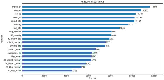 To analyze the relative importance of the input features, we calculated the number of times each feature appears in all decision trees and plotted the results in Figure 11. The more times a feature is used to construct a decision tree, the more important it is. As shown in Figure 11, it is clear that the elevation angle of the moon has the highest importance score in the cloud-distribution classification. The reason is that when the moon is present, the edges and details of low-luminosity clouds become blurred and difficult to observe. Furthermore, the moon’s brightness severely changes the background of the sky, reducing the observable magnitude and making astronomical observations unimplementable.