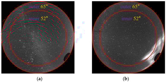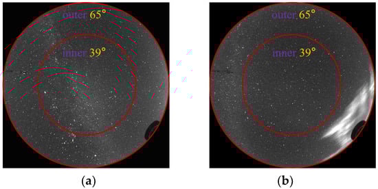 Example images of “clear” and “outer” cloud categories with the inner 52° circle at Muztagh. (a) clear, (b) outer.