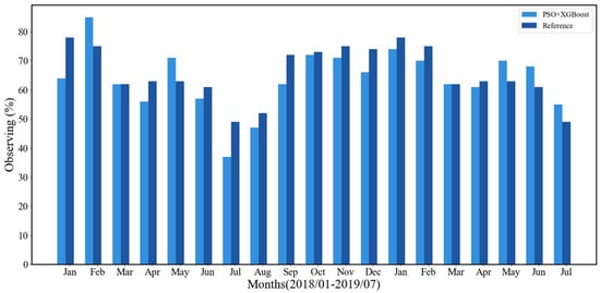 To evaluate our proposed model’s accuracy and generalization ability, we compared the results with the manual observation at Muztagh []. The manual observation was used to analyze nighttime cloud images from 2017 to 2021 to determine the length of observable time. The specific method divides the nighttime images into two regions within zenith angles of 65°, with the outer region at a zenith angle of 65° and the inner region at 44.7°. The outer and inner circles without clouds are considered “clear”. The term “outer” indicates that clouds are only detected inside the outer ring (between 65° and 44.7° circles). The observable time is the sum of “clear” and “outer”. Based on manual observation, the percentage of observable time at Muztagh in 2018 is 66%.