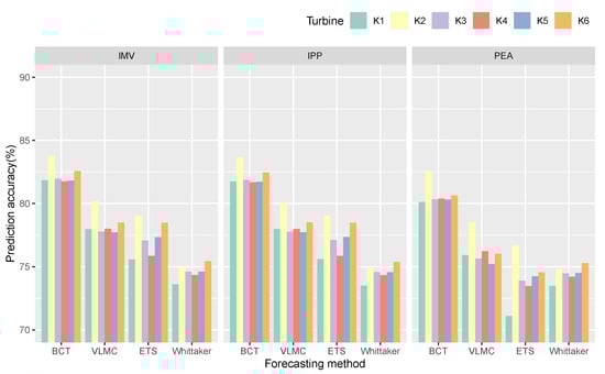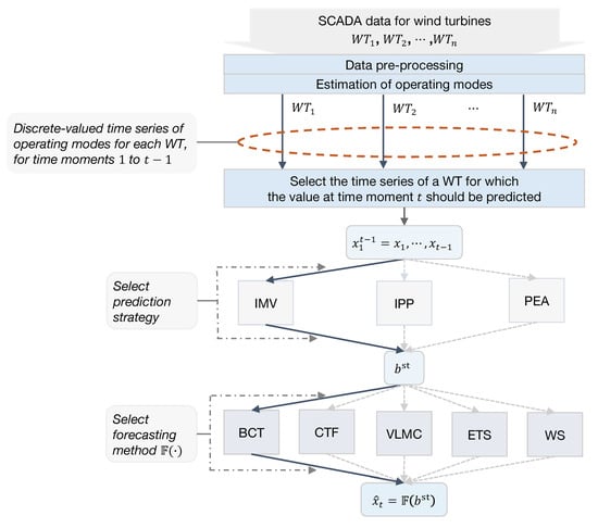 - These strategies are applied in conjunction with five different forecasting methods (BCT, VLMC, CTF, ETS, WS) in experiments conducted on two datasets. If we suppose that the operator stands for the forecasting method that we apply, then the predicted value is . For clarity, we provide in Figure 1 a graphical representation of the steps that are needed for finding the predicted operating mode for a particular turbine starting from the SCADA data available for the turbines in the wind farm.